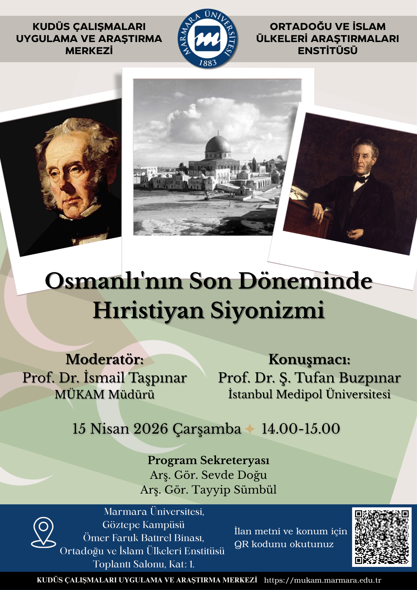Marmara Üniversitesi Ortadoğu ve İslam Ülkeleri Araştırmaları Enstitüsü işbirliğinde, Marmara Üniversitesi Kudüs Çalışmaları Uygulama ve Araştırma Merkezi (MUKAM), “Osmanlı’nın Son Döneminde Hıristiyan Siyonizmi” başlıklı bir konferans düzenleyecektir. MUKAM Müdürü Prof. Dr. İsmail Taşpınar moderatörlüğünde gerçekleşecek olan konferansa, İstanbul Medipol Üniversitesi Tarih Bölümü Öğretim Üyesi Prof. Dr. Ş. Tufan Buzpınar konuşmacı olarak katılacaktır. Konferans, 15 Nisan 2026 Çarşamba günü saat 14.00’te, Ortadoğu ve İslam Ülkeleri Araştırmaları Enstitüsü Toplantı Salonu’nda yüz yüze gerçekleştirilecektir. Tüm ilgililer davetlidir.